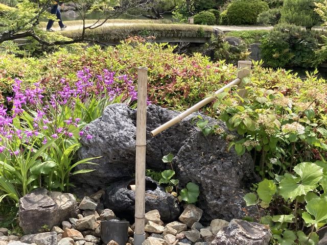 杓で水をすくって、右下の瓦に注ぎ、竹の筒に耳をあてると、凄く綺麗な音が聞こえます。