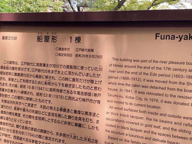 船屋形は、江戸時代、姫路藩主が河川での遊覧に使っていた『川御座船(かわござぶね)』の屋形部分だけが陸上げされたものです。